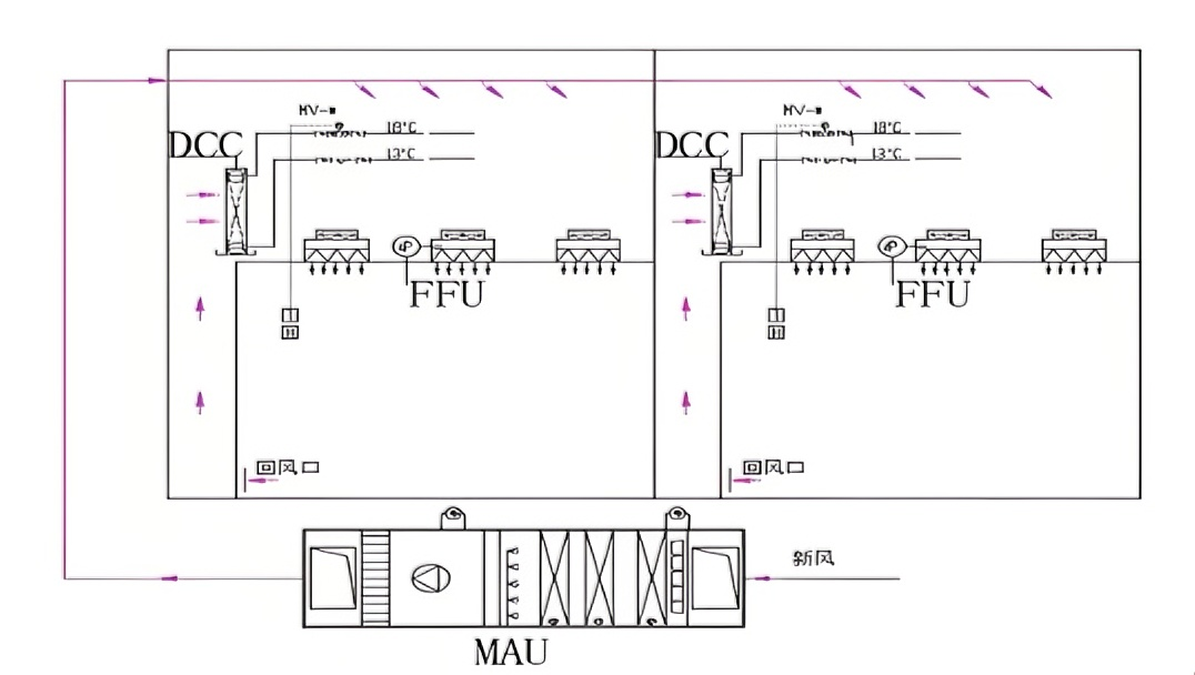 配合系统运行:与MAU(组合式新风机组)、FFU (风机过滤器单元)共同构成MAU+FFU+DcC洁净空调系统。MAU负责引入新风、控制温湿度和维持正压,FFU保证空气洁净度,DcC则承担去除显热的任务,三者协同工作,为半导体生产提供工艺环境。